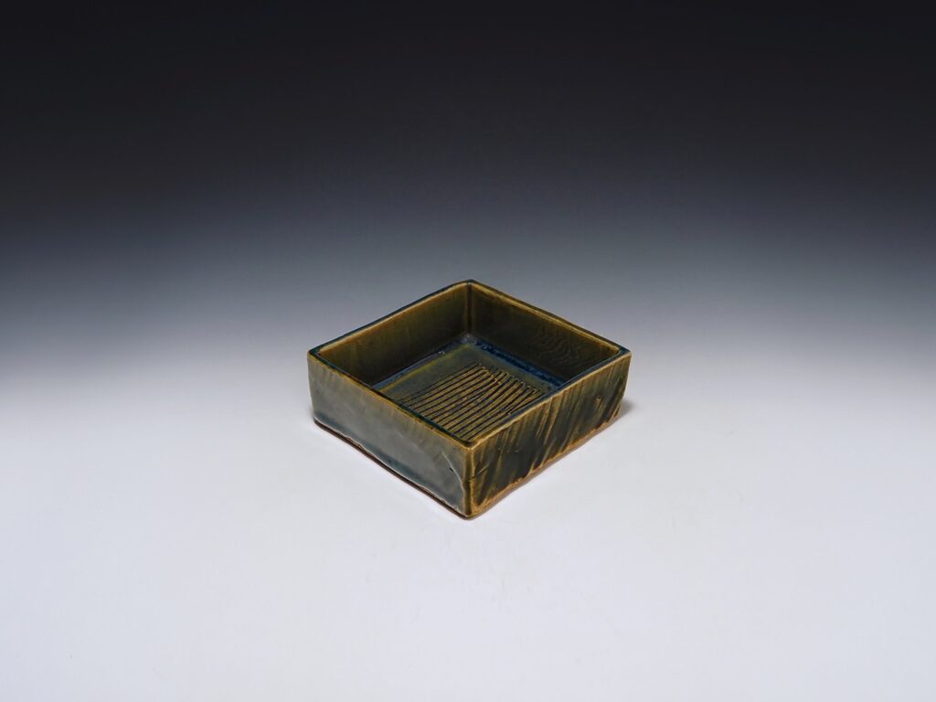 大正13年(1924)京都東山窯の工場長だった「荒川豊蔵」氏と出会い昭和2年(1926)陶房に招き、色々な釉薬等を研究しました。その中で織部釉がとても良い色を出せましたので織部を多く焼きました。1955年から二度に亘り、織部焼での「人間国宝」指定を断っています。晩年は金銭事情が悪く、奨学金も入るのに、国(芸術が解らぬ)が決めるものは受けたく無いのです。この作品は毎日でも使え、用途が豊富で魯山人の素敵な織部作品です。・昭和10年(1935)頃の作品