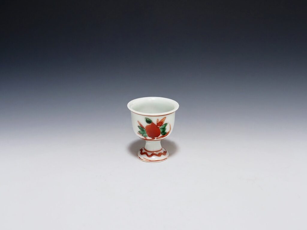 魯山人の盃は志野焼の人気が高いですが、それより人気が有る作品が呉須赤絵のものです。志野とは味わいが異なりますが、この背の低いあかごす馬上杯は絵がのびのびとして可愛いく、綺麗な作品です。勢いの有る筆使い、赤と緑の絶妙なバランスが清々しく気分爽快です。酒類は勿論、珍味入れ等にも使え毎日身近に置きたくなる、とてもかわいい名作です。・昭和15年(1940)頃の作品