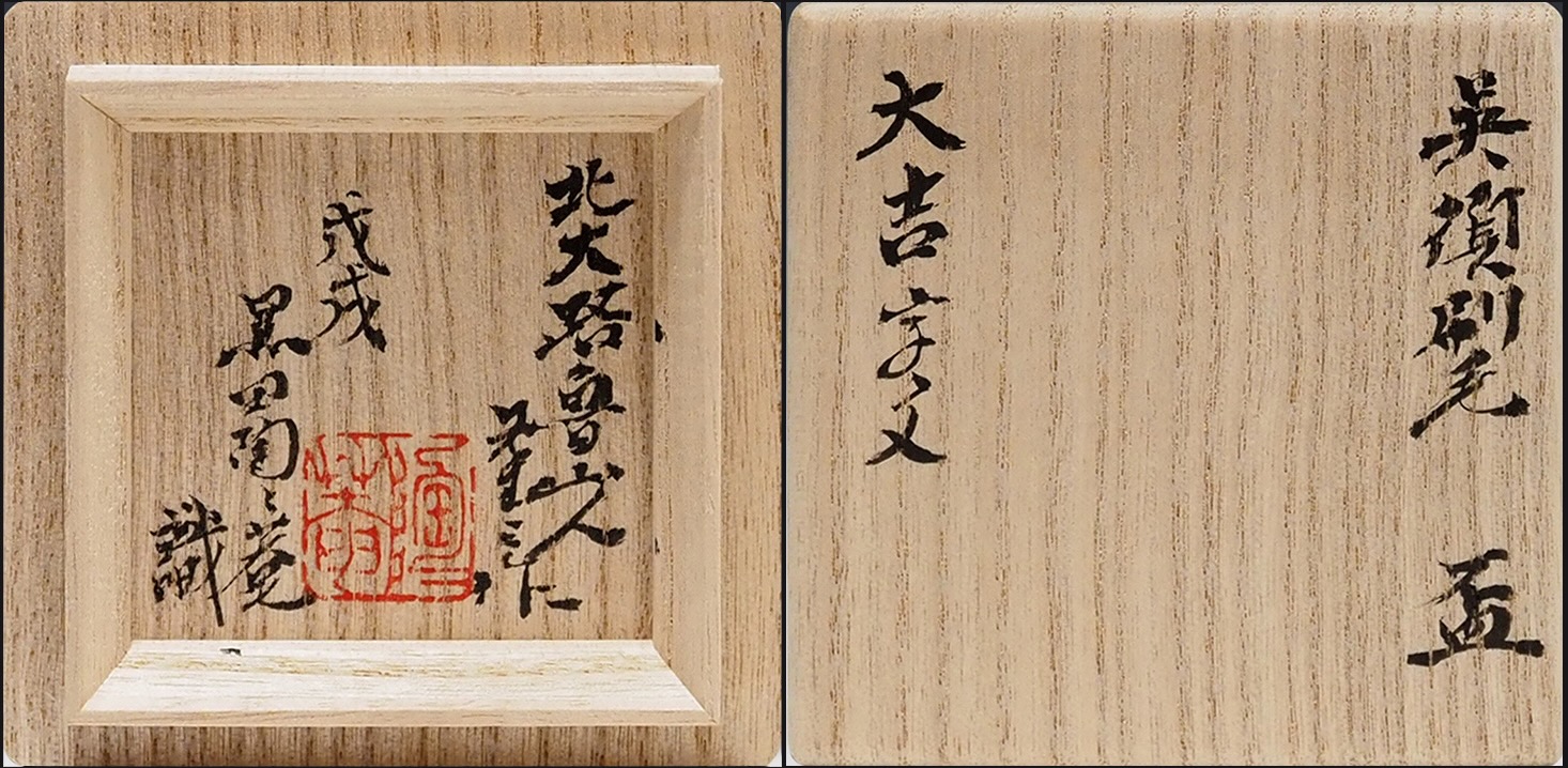とても可愛いく綺麗な盃です。高台内に「魯」と染付でサインを入れ、周りに呉須を塗りつぶし「大」「吉」と2文字かいています。魯山人はよく染付鉢やあかごすの徳利などに「大吉祥」と3文字を書いた作品を残していますが、「大吉」2文字書いた作品は大変珍しく、初めてみました。口触りがとても良く飲みやすく作り、小さな盃なので料理に合わせて酒を上品に頂けると作品です。・昭和8年(1933)頃の作品