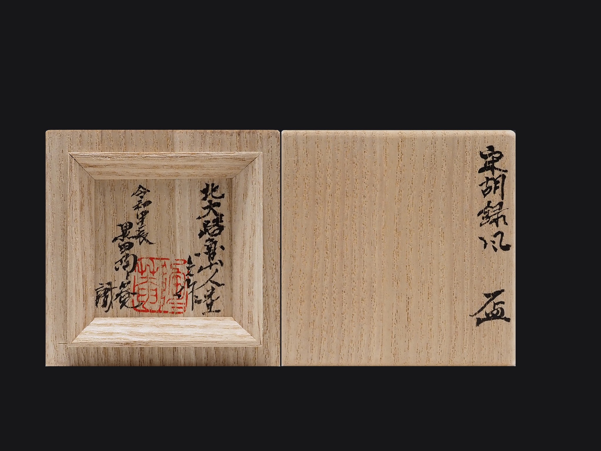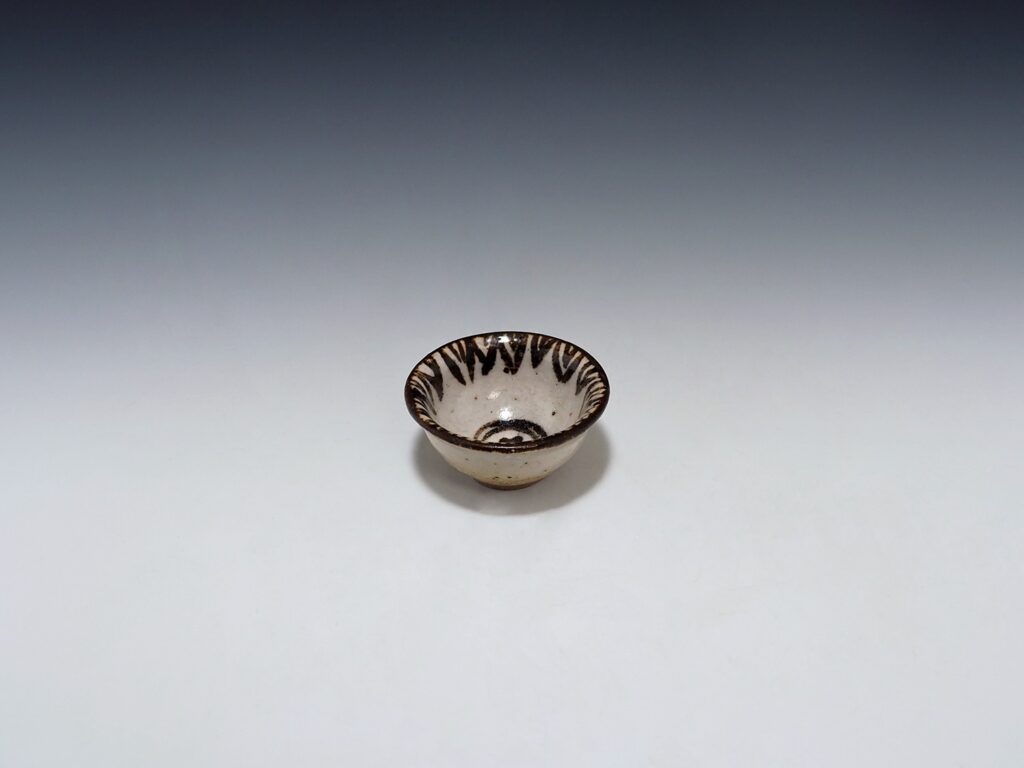 スンコロクは、タイの古都スワンカロークで13世紀から16世紀に焼かれた古陶です。魯山人はその雰囲気を稚拙の様な絵図柄を描き見事に作り上げています。鉄絵で描かれ志野薬でしょうか高台付近を避け全体に掛けています。使ってみると飽きの来ない面白い絵がとてもよく楽しくなります。いろいろ出来る魯山人はやはり天才と呼べると思われます。毎日使え面白い盃は名作でしょう。・昭和30年(1955)頃の作品