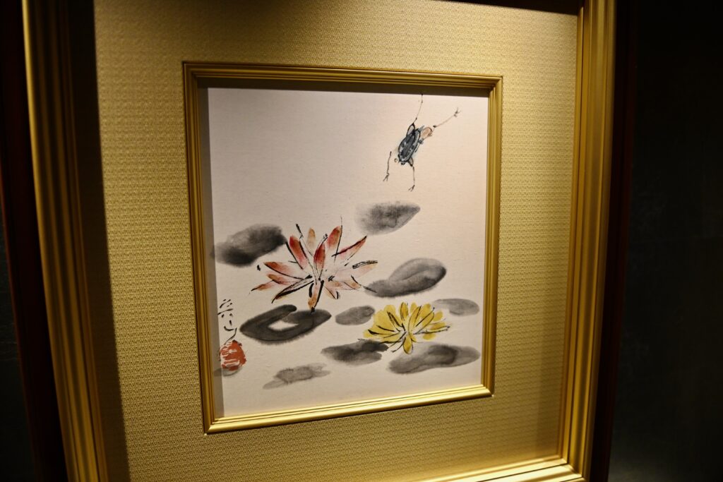 「古池や蛙飛び込む水の音」と松尾芭蕉の句が思い浮かぶ愛らしい絵です。桃色と黄色の蓮が色鮮やかに描かれ、青緑の蛙が勢いよく池に飛び込もうとしています。幼少から絵が好きで絵描きに成れたらいいと思っていた魯山人、東京に出てからもずっと書の筆と一緒に絵筆も購入していたようです。魯山人の絵画特に即興はどれを見ても心温まる気持ち良い物ばかりで、その中でもこれ程色鮮やかな色紙作品はとても珍しい物です。素晴らしい自然の良さを描く作家は近代数人しか居らず、これも貴重な作品です。・昭和15年(1940)頃の作品