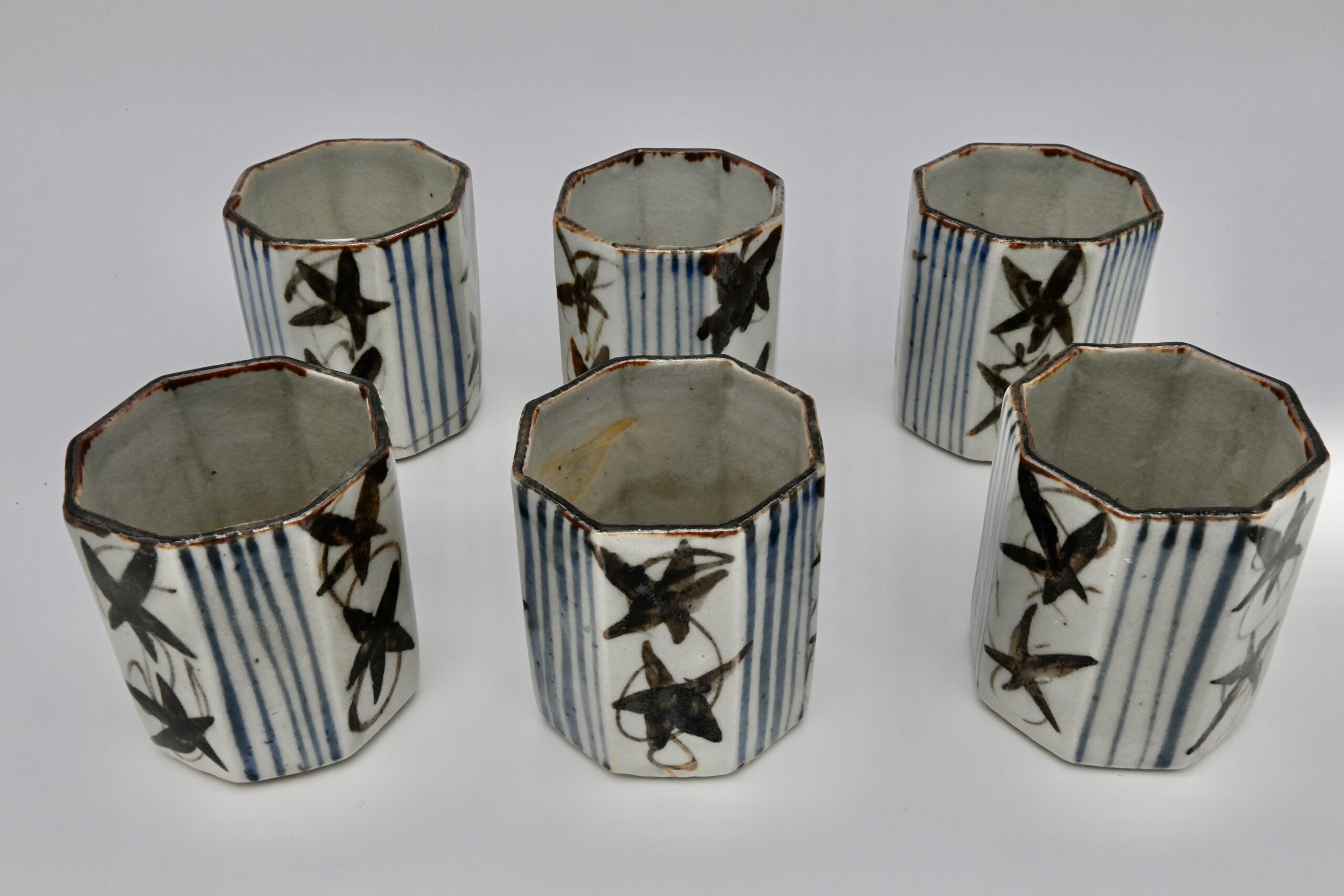 石川県立美術館にて開催された「古九谷の風土が育んだ近代陶芸四巨匠展」にて出陳されたこちらの特徴は、料理を立体的にかつ美しく見せる、八角形の洗練された形状と深さにある。釉薬の独特な色合いや質感は、光の加減で表情を変え、一つ一つに手仕事の温かみが宿る。六客の中にも絶妙な個体差があり、芸術性と実用性を兼ね備えた名品である。