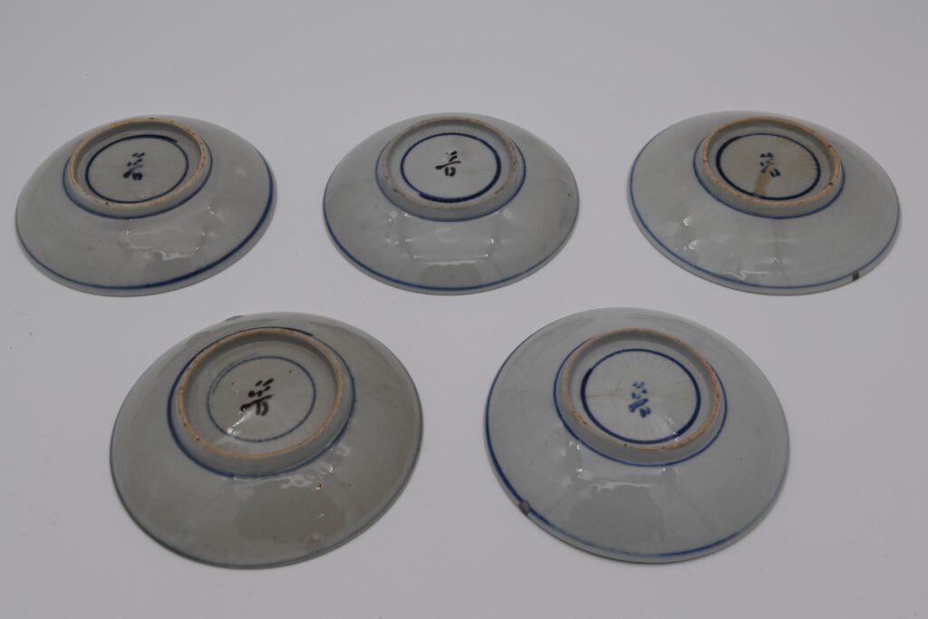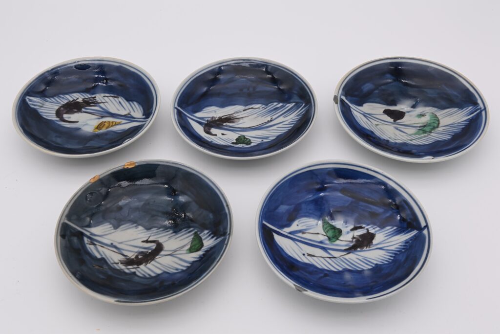 丸皿の中に木の葉と蝦絵が描かれている珍しい作品。海老のように長にひげを生やし、腰が曲がるまで長生きできるようにとの願いから海老の絵は明の時代から描かれていました。