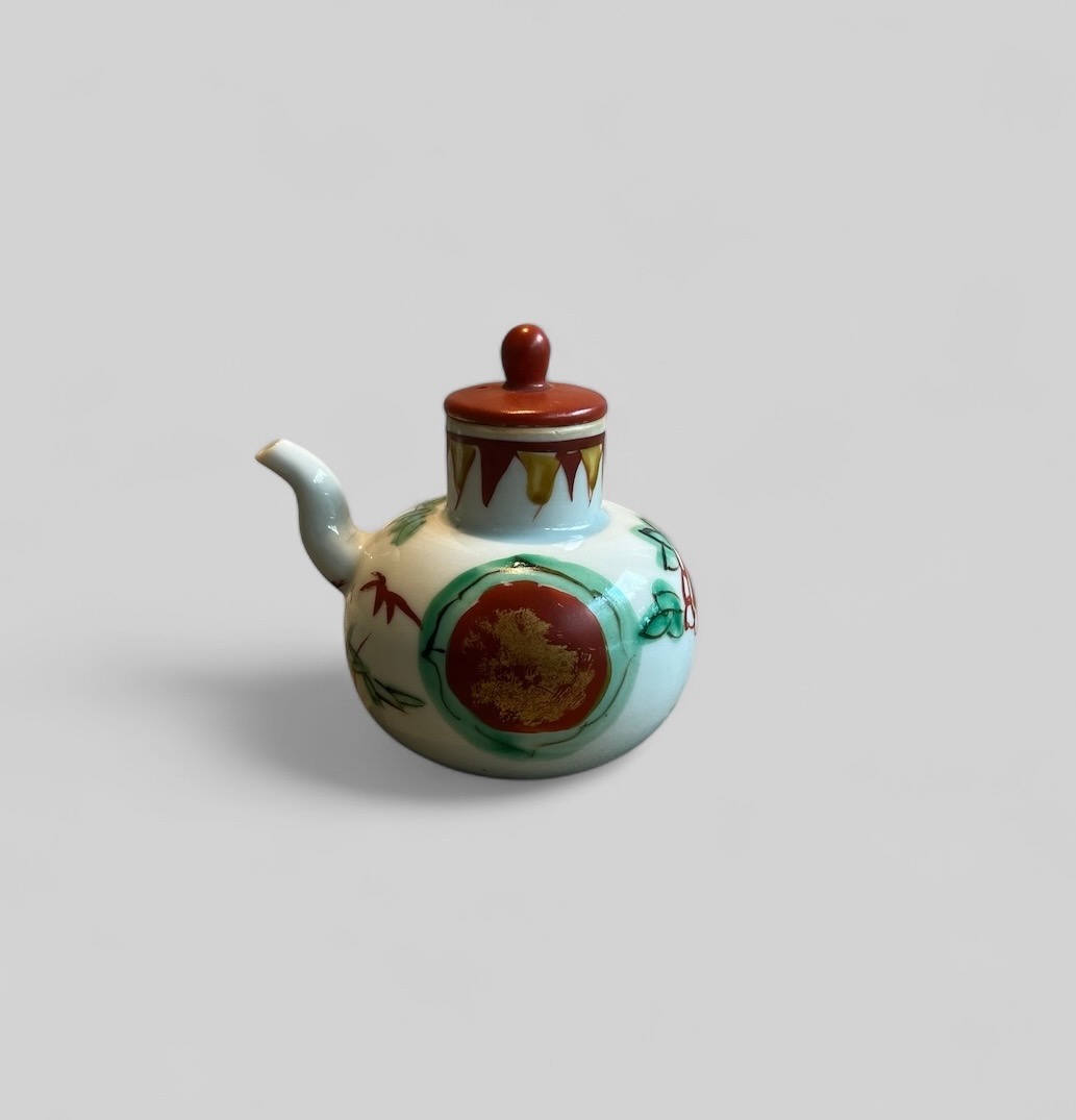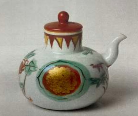 魯山人が得意とした汁次(醤油差し)の中でも最も代表的な牡丹竹林金箔手のデザイン。世田谷美術館に同手の作品が所蔵されていますが、当作はさらに蓋につまみを施したものである。箔にスレがあるのはあえて、中国の明時代に作られた金襴手に倣い古格を表現したものである。絵付けも魯山人の細やかな筆力が発揮され、小品ながら代表作と評して良いと言われている。魯山人作品の定本である作品集にも掲載。