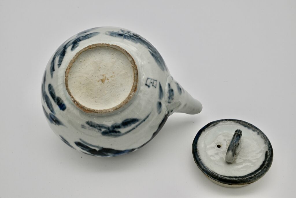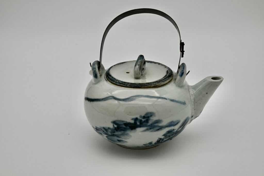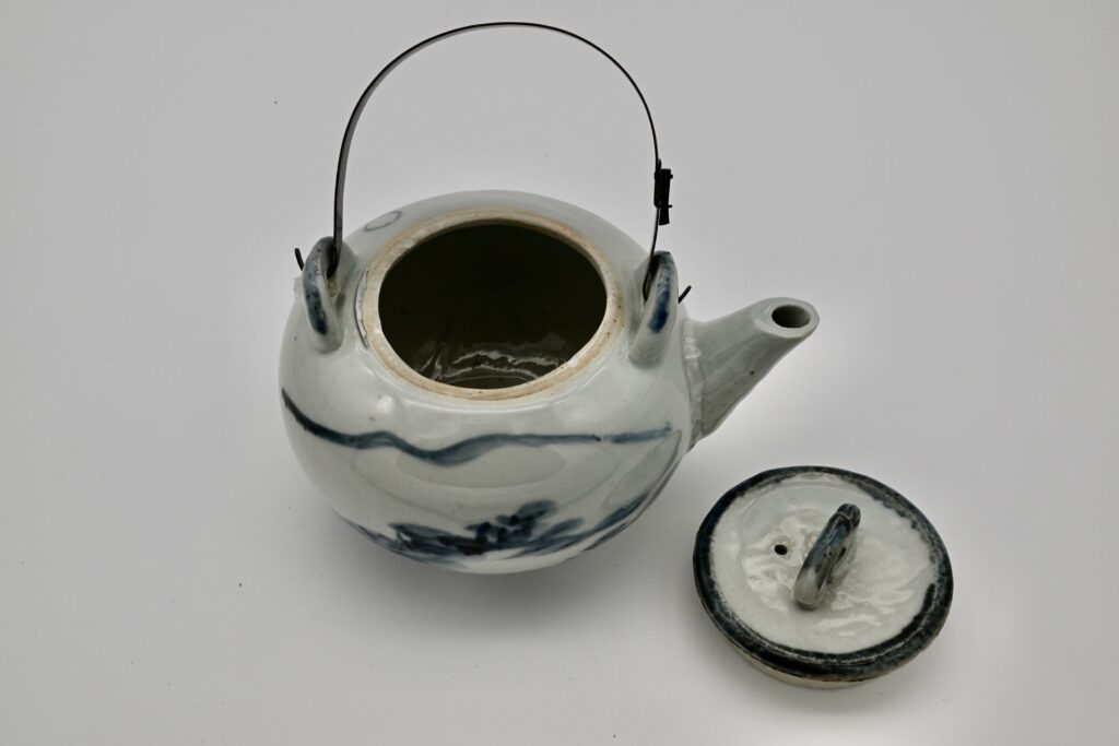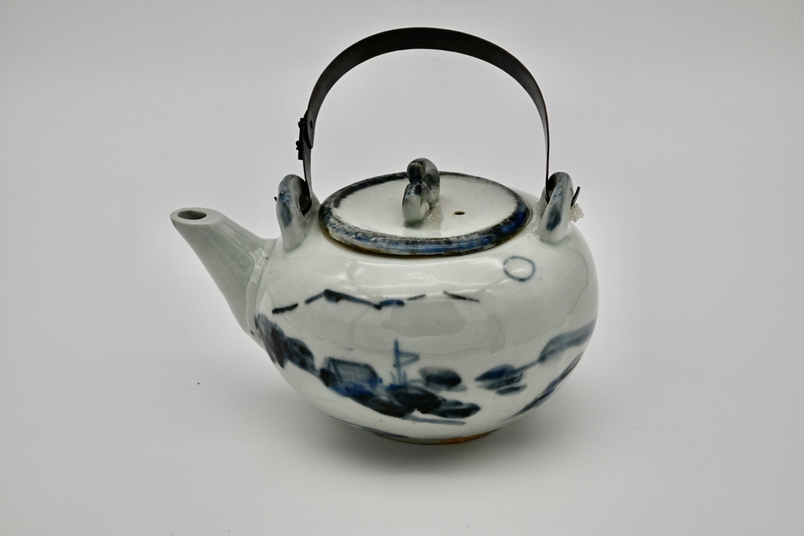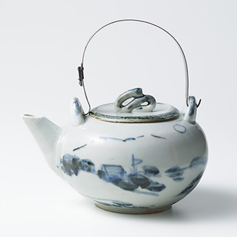 キリッと上を向いた注ぎ口。蓋は棒状に手捏ねされた粘土をS字にした少し高さのあるつまみを付けるため、中央向かってやや窪むように作られている。たっぷりとした胴には軽やかに風景画が描かれている。満月は山の上、だいぶ空高くまで昇り、最下部には打ち寄せる波、遠景には大きくなだらかな山が手早く描かれている。おおきく膨らんだ土瓶の胴部のおおらかさは、風景画の長閑な雰囲気とあいまってどこか心を落ち着かせる。注ぎ口付け根下に染付による「呂」のサインが入る。山水に家屋を描いた珍しい染付の土瓶です。この形で様々な土瓶を作っています。摘みに凝り見所の一つとなっています。昭和20年後半から30年頃の作品です。