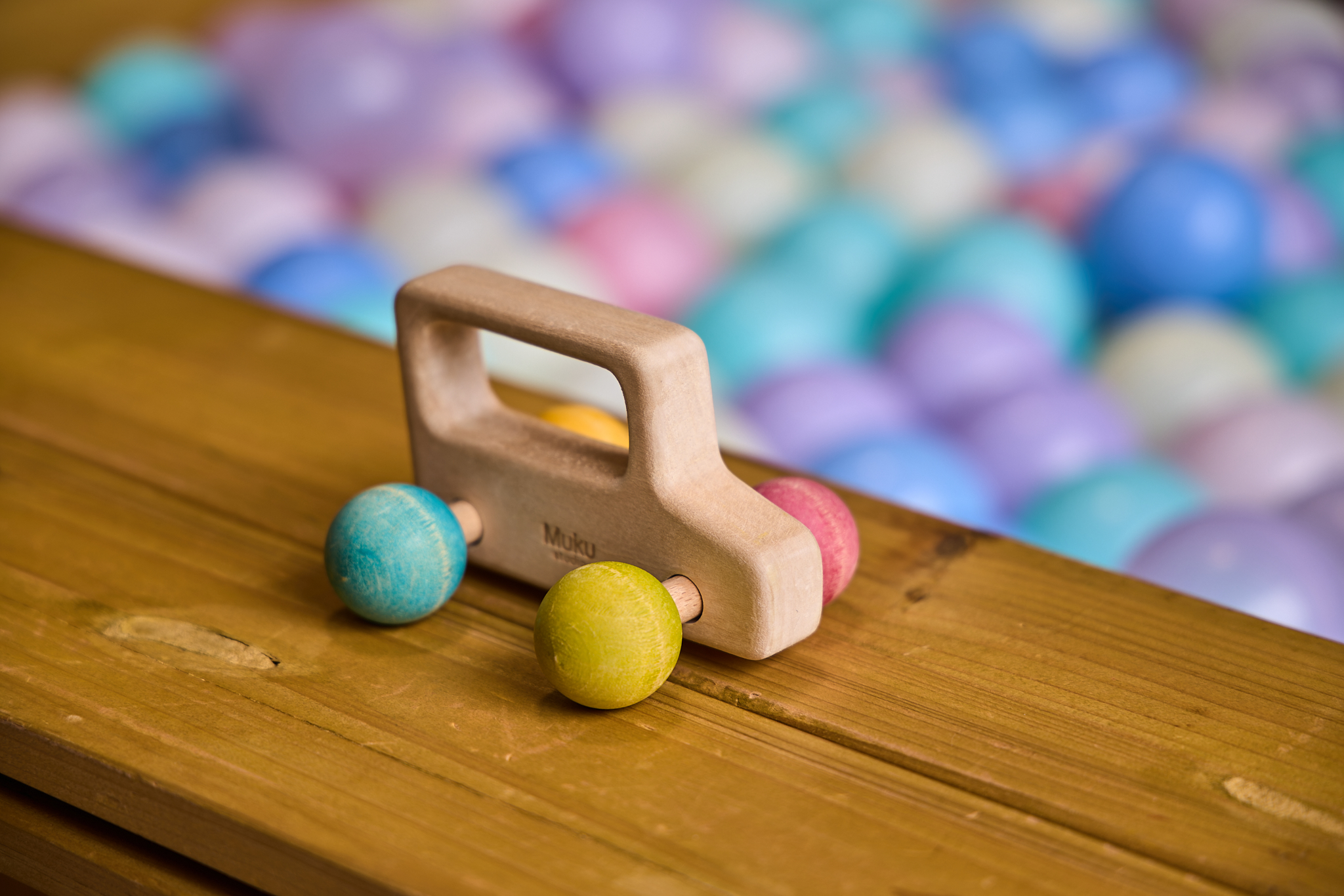 2階のキッズルームには木のジャングルジムや人気のボールプール、木製レールの電車などお子様が楽しく遊べるおもちゃや絵本を設置しております。