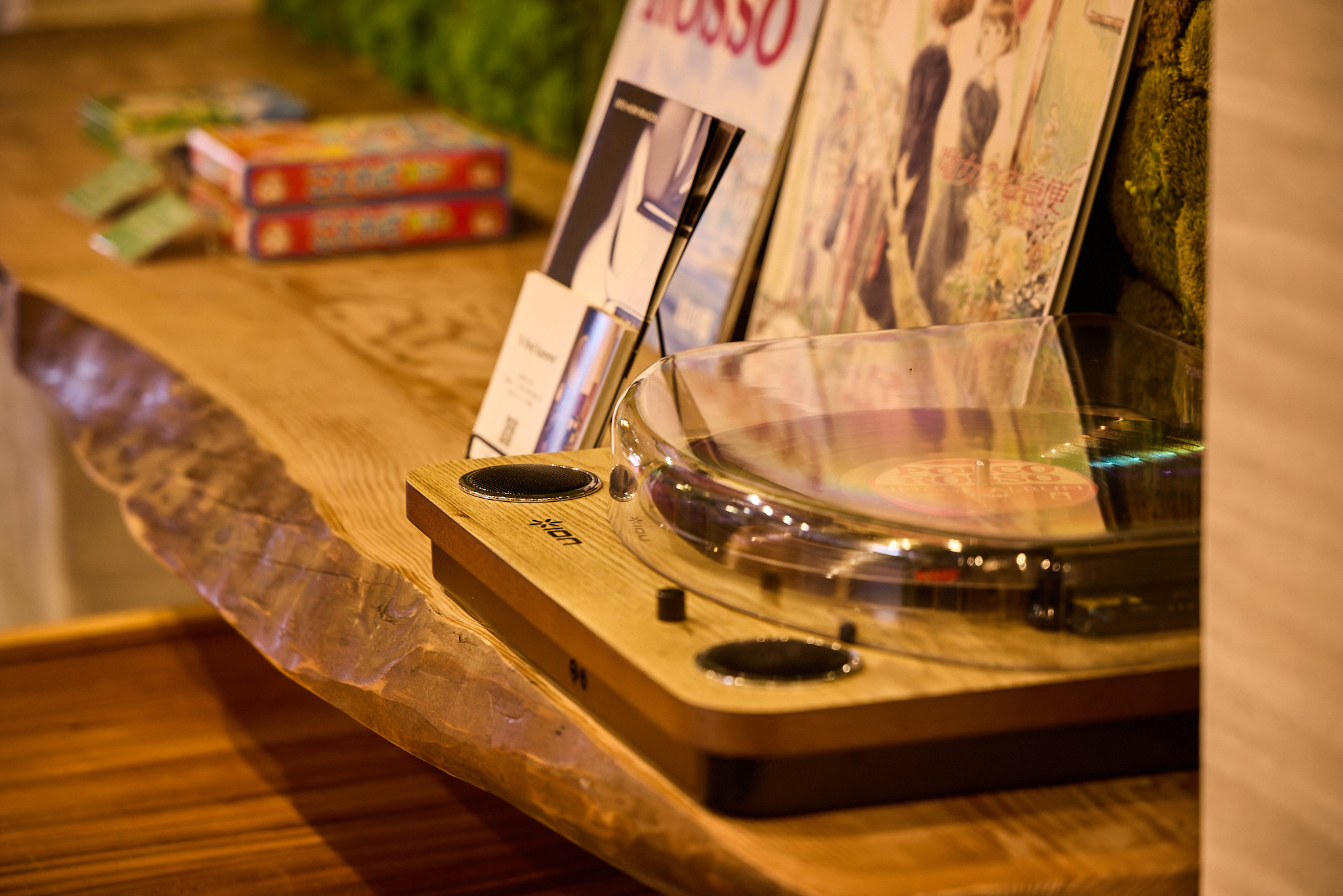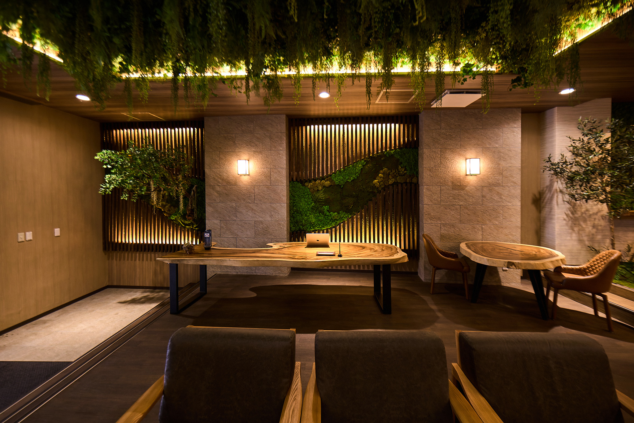 緑あふれるラウンジスペース、中央に設置された大きな木は圧巻です。客室以外の場所でのんびり寛ぐ、温泉×ワーケーションなど、お好みでご自由にお過ごしください。ガーデンカフェではフードメニュー、アルコールをご用意しております。地元食材を活かしたメニューをお楽しみください。