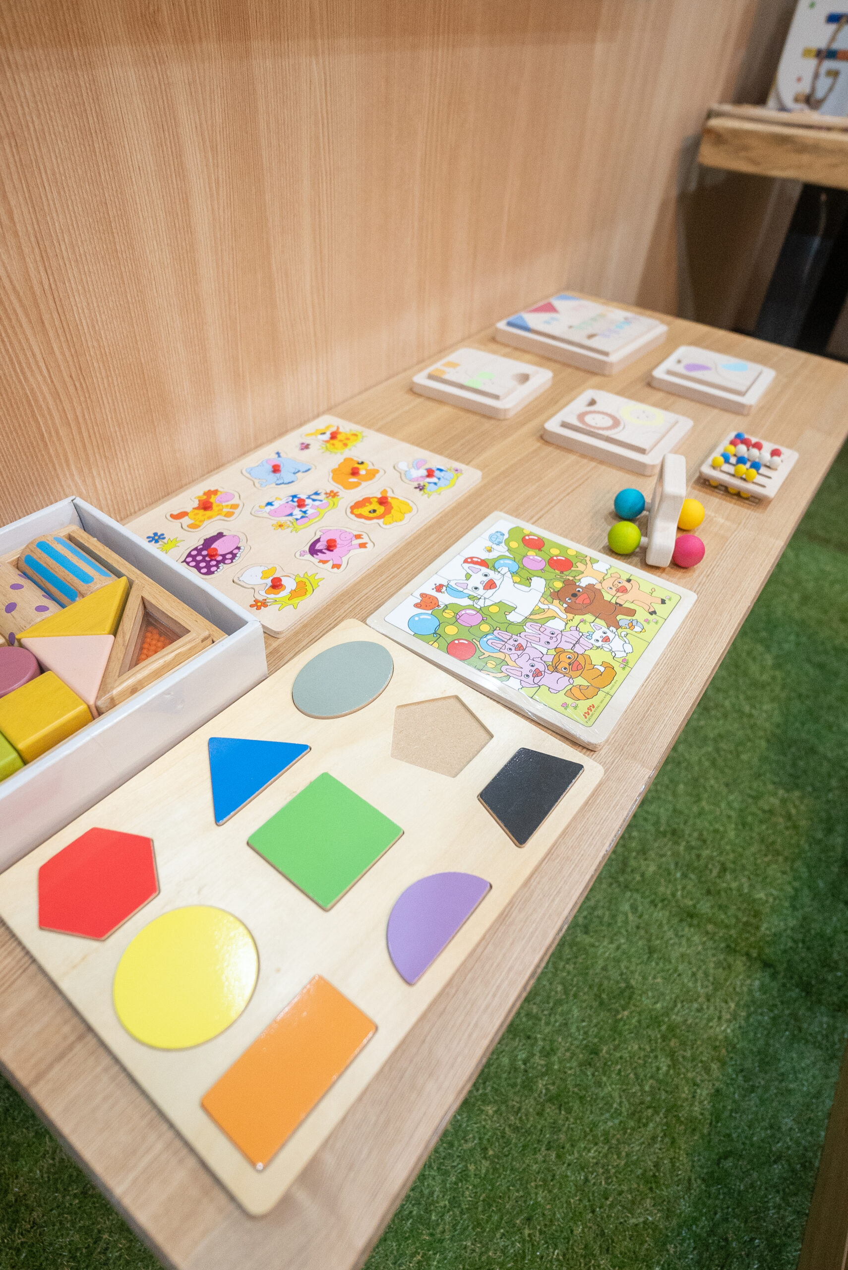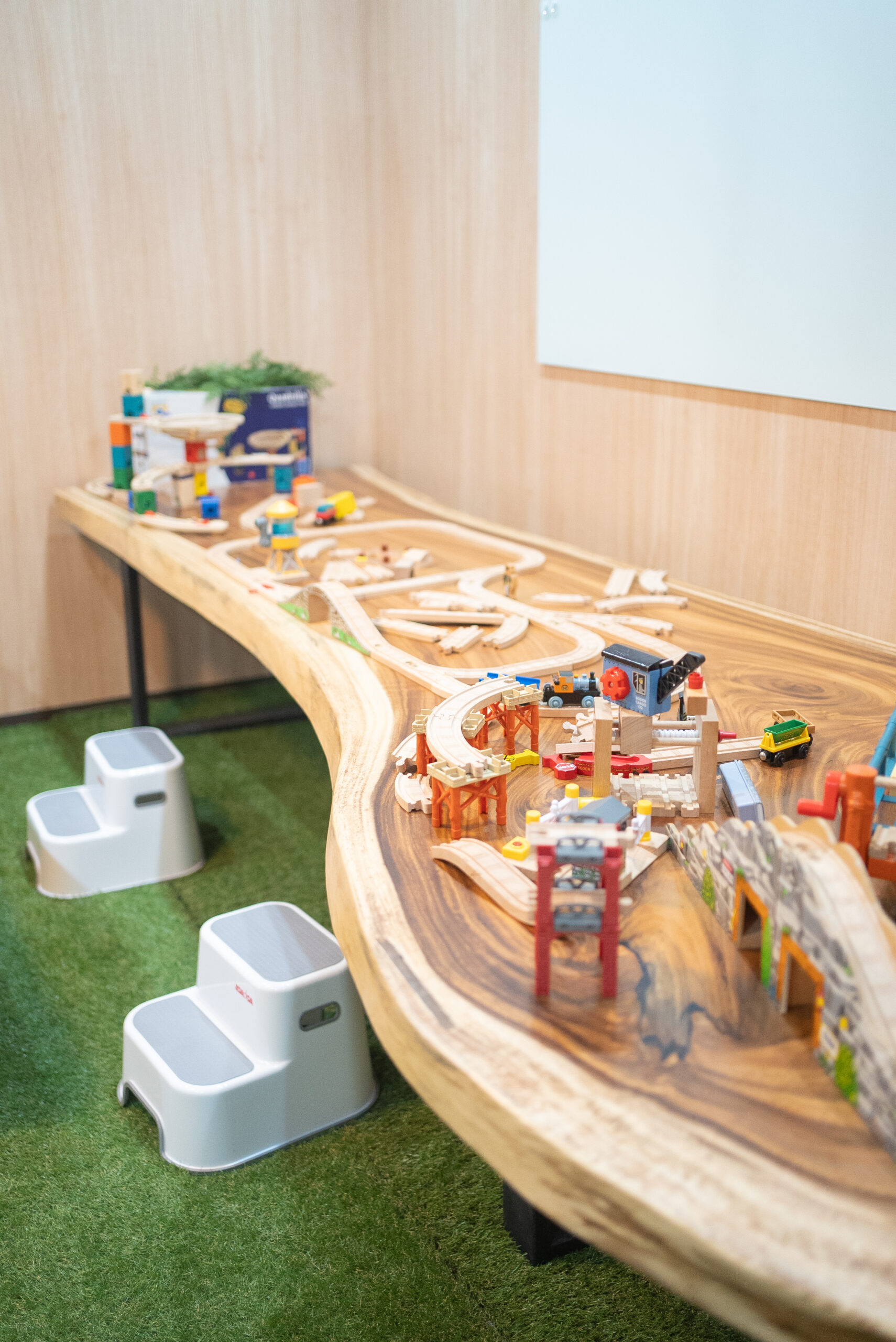 2階にキッズルームをご用意しております。木のジャングルジムや人気のボールプール、木製レールの電車などを設置。おもちゃ、絵本、DVDの上映もございます。芝生マットの上で安心して楽しめる空間です。